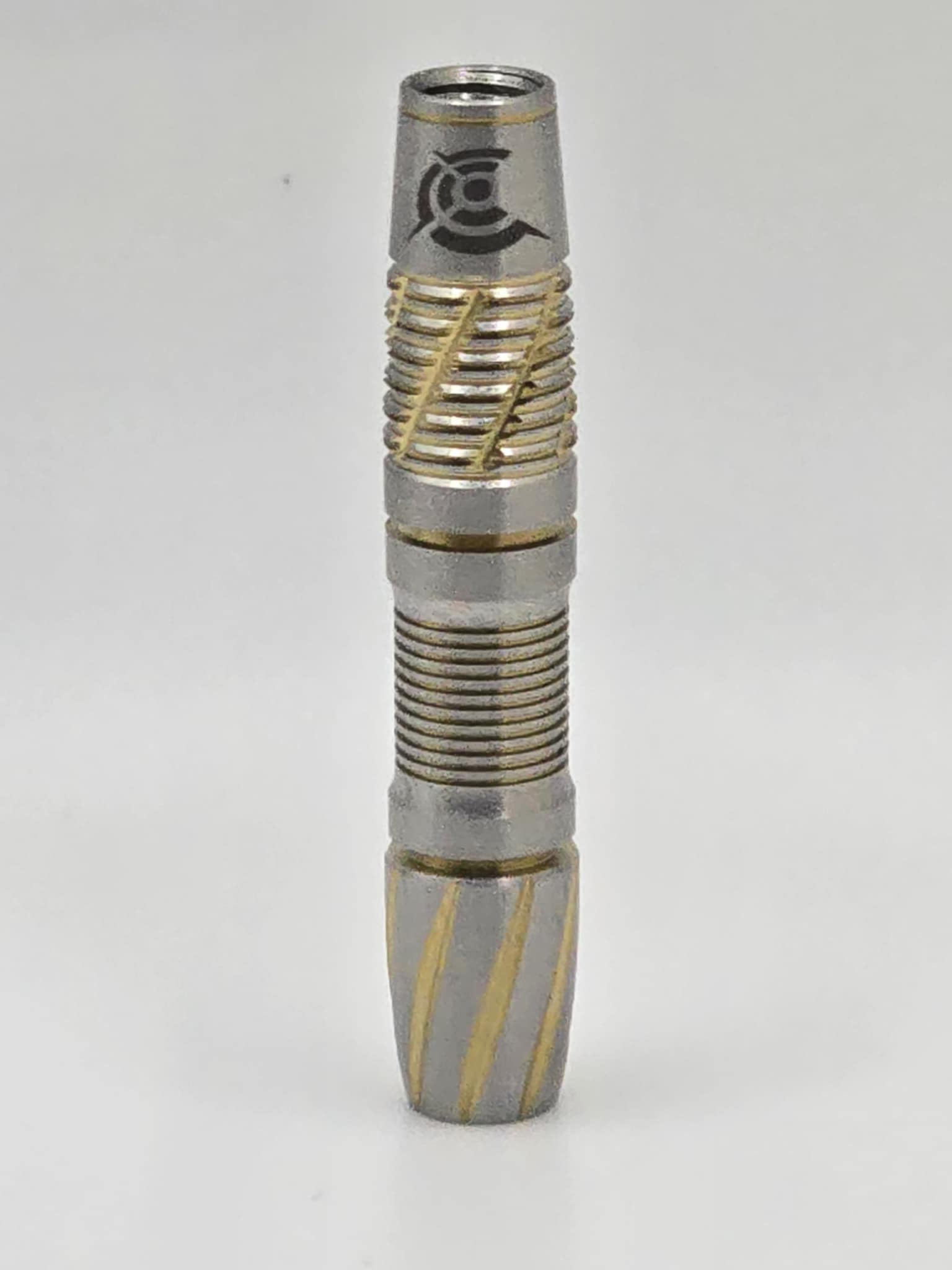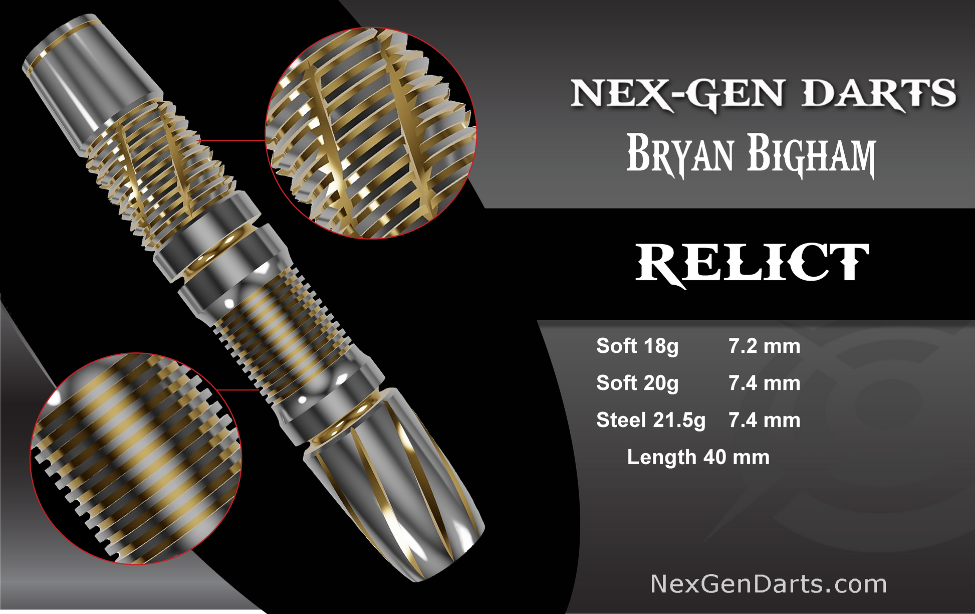 Bryan Bigham signature series model. The dart is a shorter barrel measuring at only 40mm with a diameter of 7.2mm. There is an indent in the middle of the dart which is strategically located to allow a consistent finger placement. This 95% tungsten barrel has several different types of cuts which could be considered as a medium grip. This dart is offered in both soft tip and steel tip.